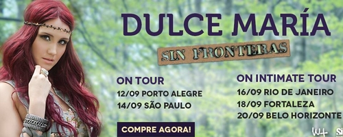 Os ingressos para a nova tour da cantora mexicana Dulce María já estão disponíveis para venda. A ruiva já havia anunciado que faria shows em setembro no Brasil, chegando até confirmar as cidades que sua tour passaria. A ‘Sin Fronteras On Tour’, até então, passará pelas cidades de Porto Alegre, São Paulo, Rio de Janeiro, Fortaleza e Belo Horizonte.